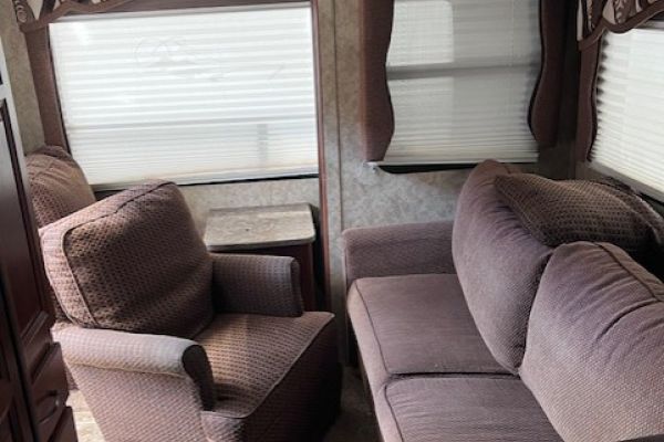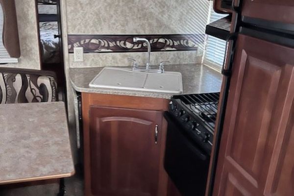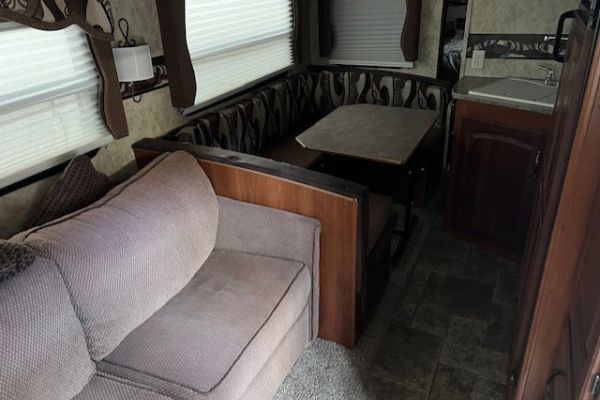 This unit has one slide-out and all the standard amenities: Fridge, stove, furnace, hot water, and air conditioner. It comes with a powered awning and outside shower. It has a Winegard satellite dish mounted to the roof, a 100-watt solar panel with an MPPT controller and two TVs. There is also an RVQ hookup on the back of the trailer. Sleeps 6, front bedroom, dinette folds down and pull-out couch.